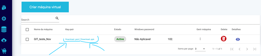 Com a criação da máquina, duas chaves são geradas automaticamente: .ppk e .pem